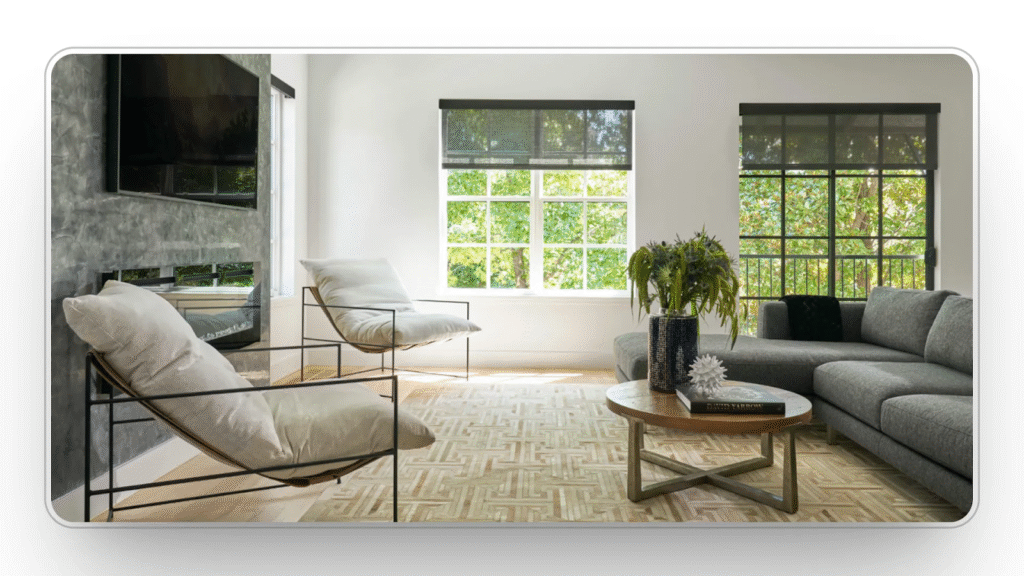 Shading glass reduces unwanted heat gain, and filtering fabrics soften harsh glare, which makes rooms more comfortable in summer.